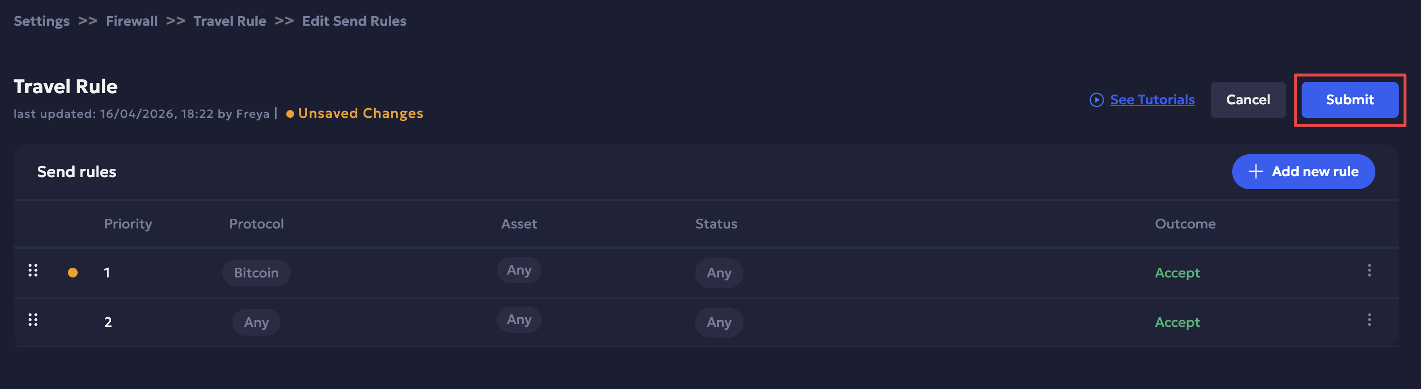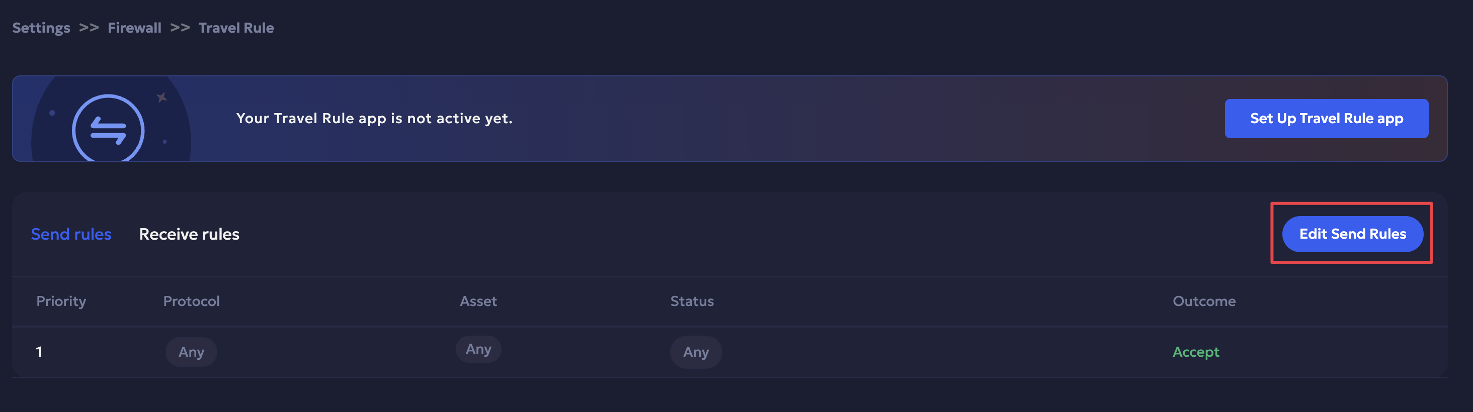 - Travel Rule for Send and Receive: Priority:1, Protocol: any, Asset: any, Status: any, Outcome: any