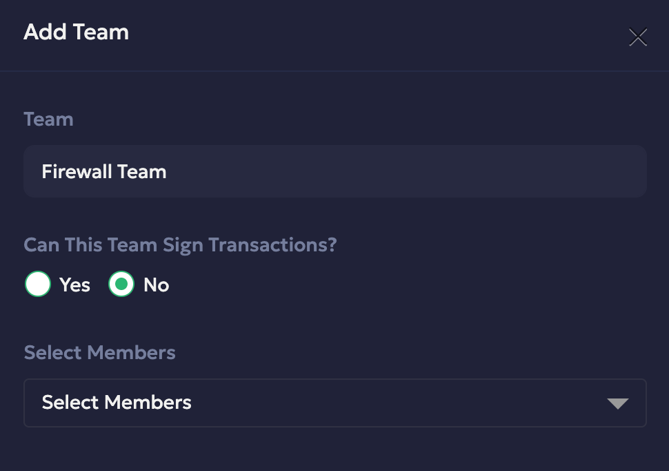 Owners and Admins can create a non-signing team to initiate the Firewall transaction. The Firewall team helps to approve the transaction initiation request.