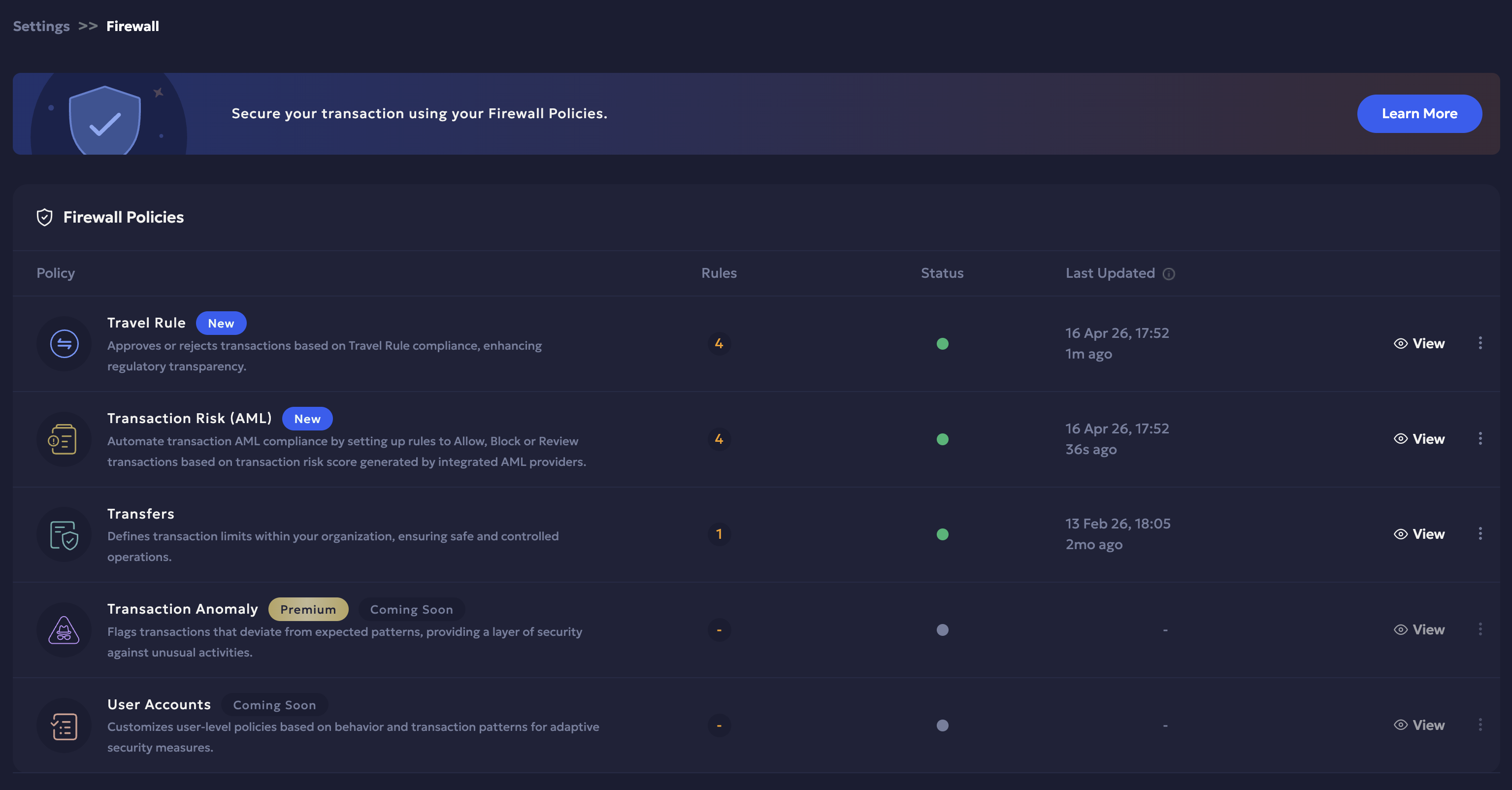 - Ensure you have signed up for Travel Rule and Transaction Risk policies.