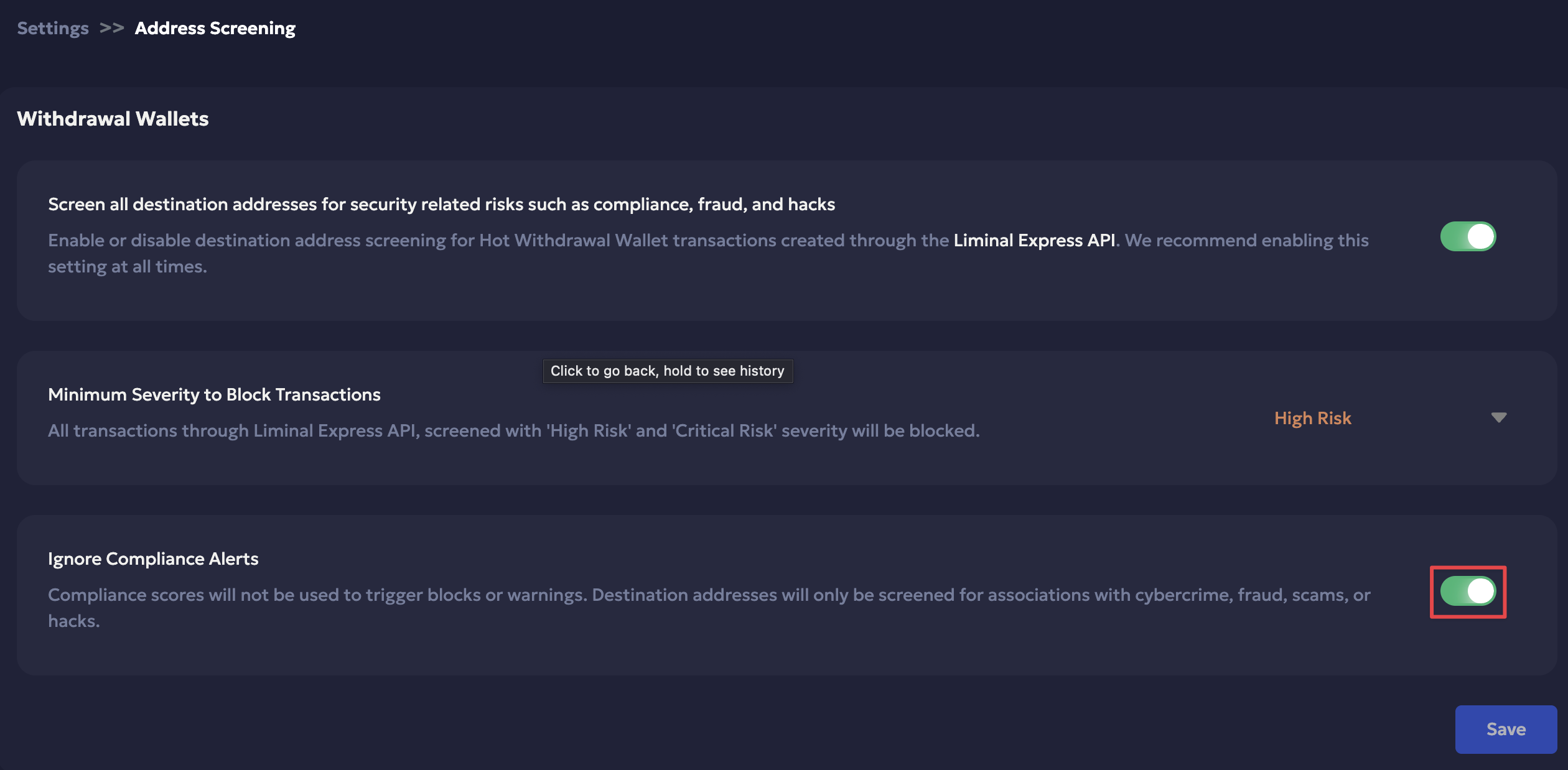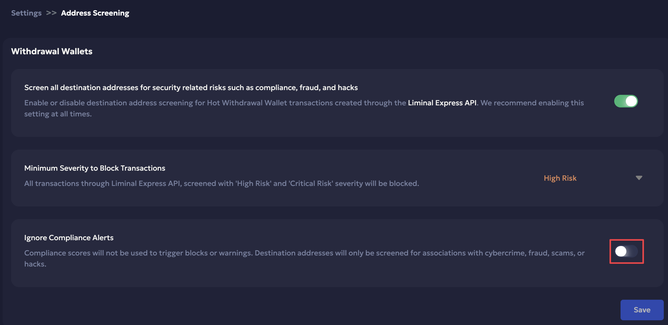You can toggle off the Ignore Compliance Alerts policy at any time to include compliance scores within the risk score calculation. Transactions that exceed the configured compliance score threshold will be blocked, and alerts will be triggered through the Liminal Express API when enabled.