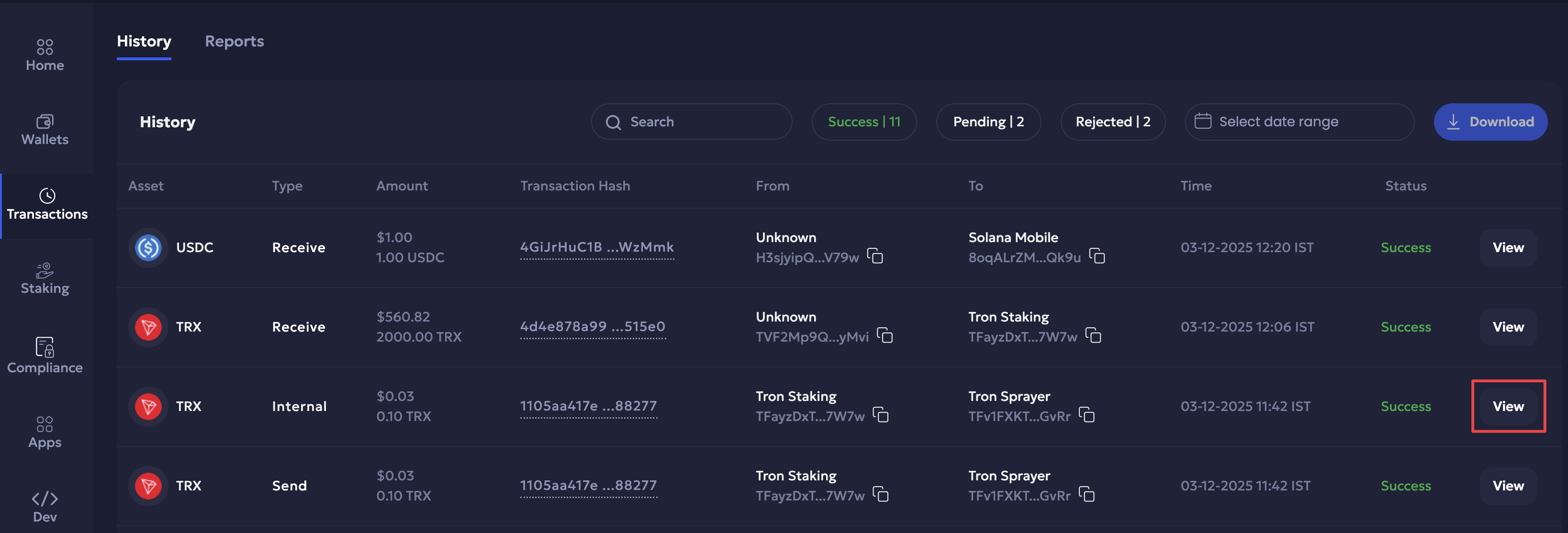 - Transaction status: Click either the Success, Pending, or Rejected buttons to filter transactions based on their statuses. This metric also shows the total number of items in your filtered list.