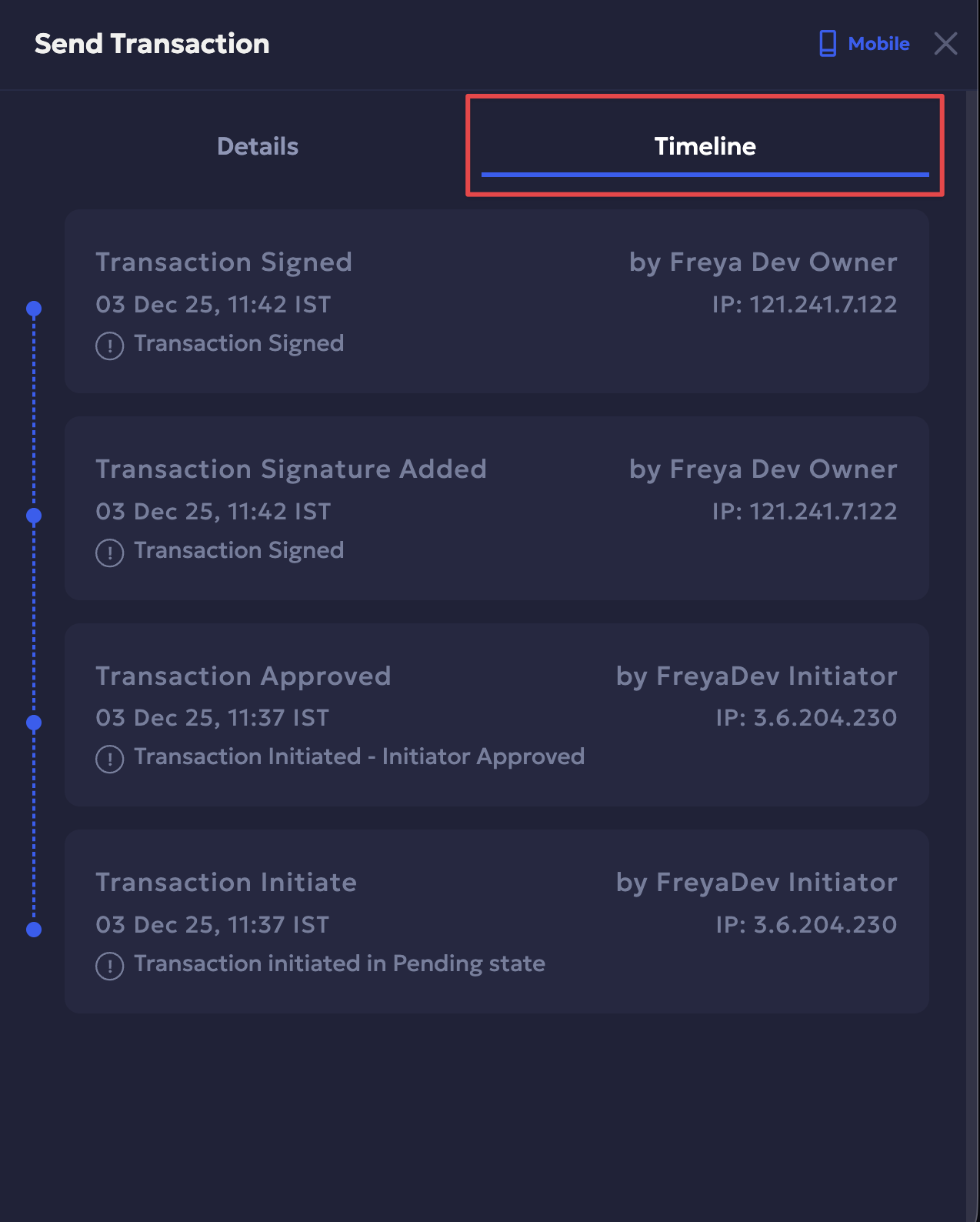 - Timeline: Shows a chronological sequence of events triggered during the transaction.