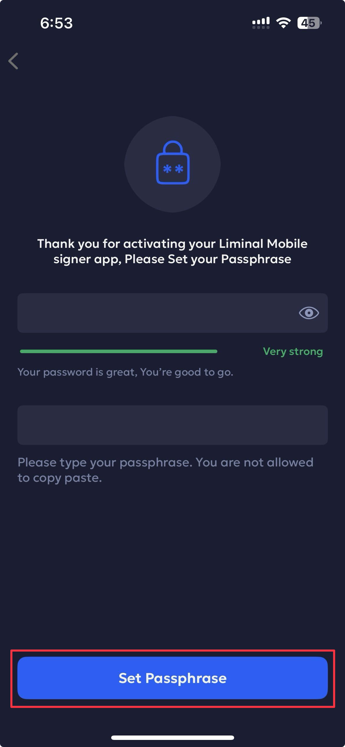 Enter the passphrase and re-enter to confirm. Tap Set Passphrase to successfully set up the passphrase.