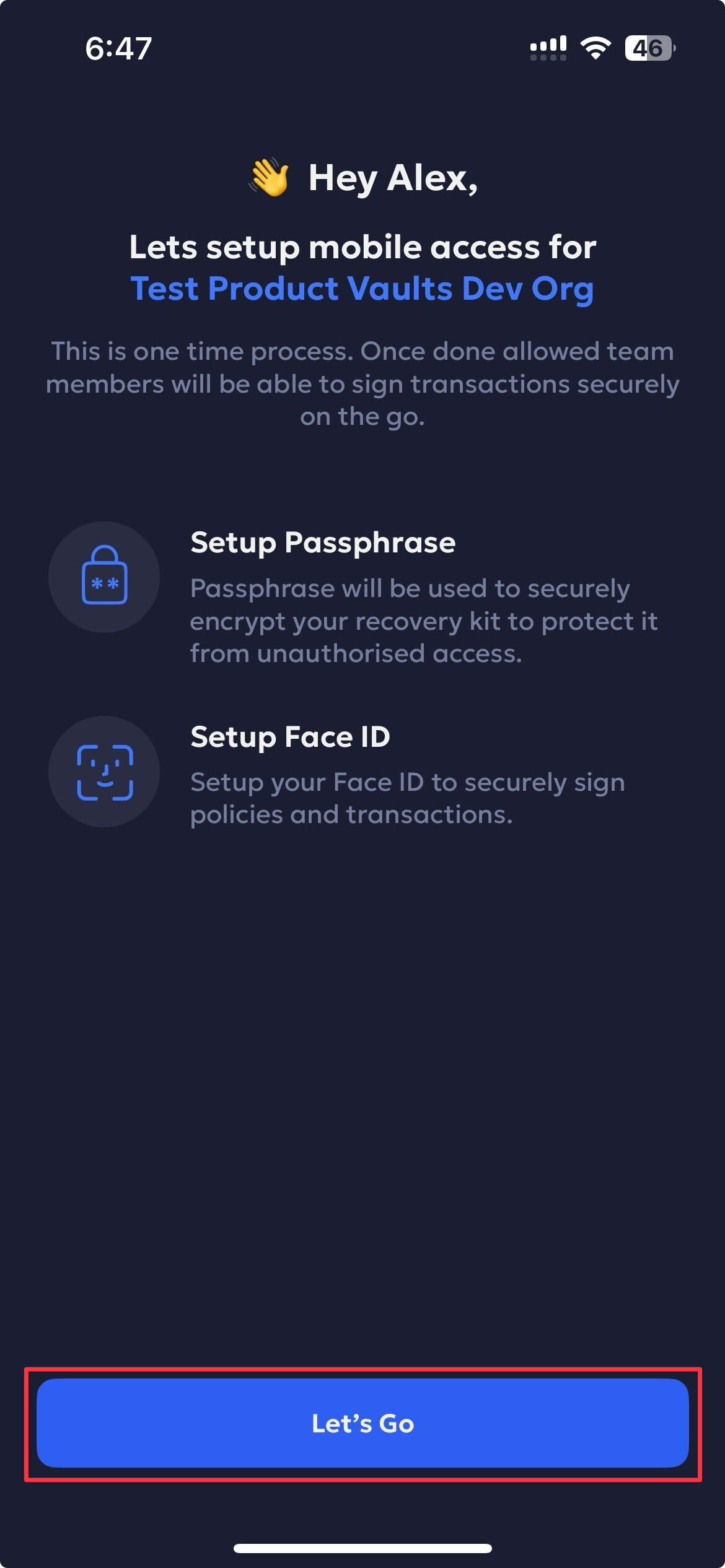 Tap on Let’s Go to set up your passphrase and faceID.