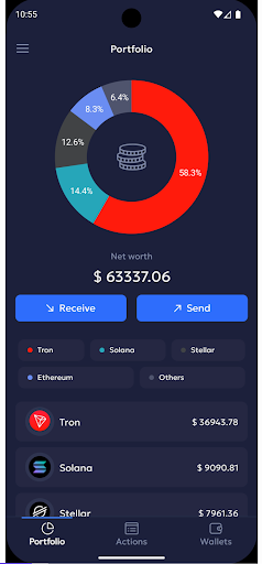 You can view real-time asset balances across your wallets. The portfolio dashboard shows: