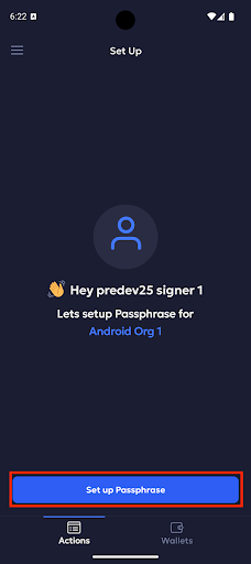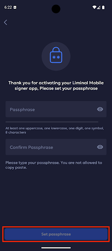 You must set up a passphrase and biometric identification to continue onboarding and activate your Liminal Vaults mobile signer account.