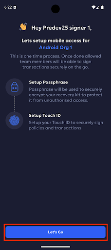 Select Let’s Go to set up your passphrase and biometric identification, respectively.