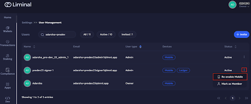 Click the hamburger icon to the right of the required user’s row and select Re-enable Mobile.