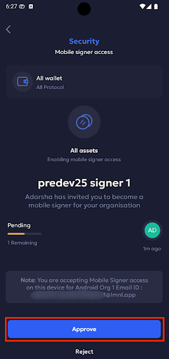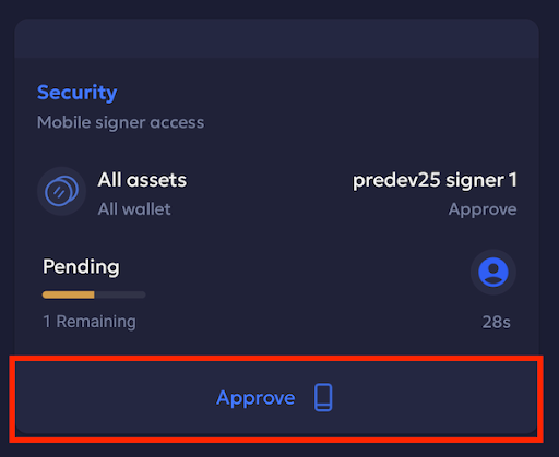 You will find a security card requesting approval for mobile signer access. Click Approve on the card to accept the shard.