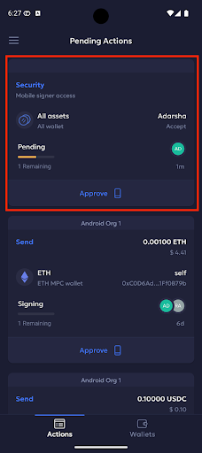 Navigate to the Actions tab of your Liminal Vaults mobile app, and you will find a security card requesting approval for mobile signer access.