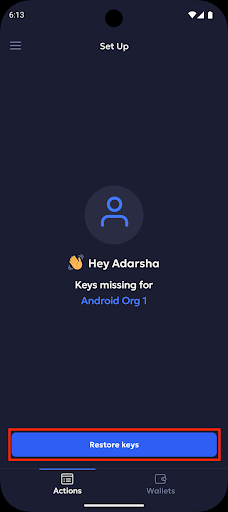 You have successfully restored your MPC signing keys for the mobile app as a signer and can proceed with signing transactions that need MPC keys. Click Continue to check pending actions in the Actions tab.