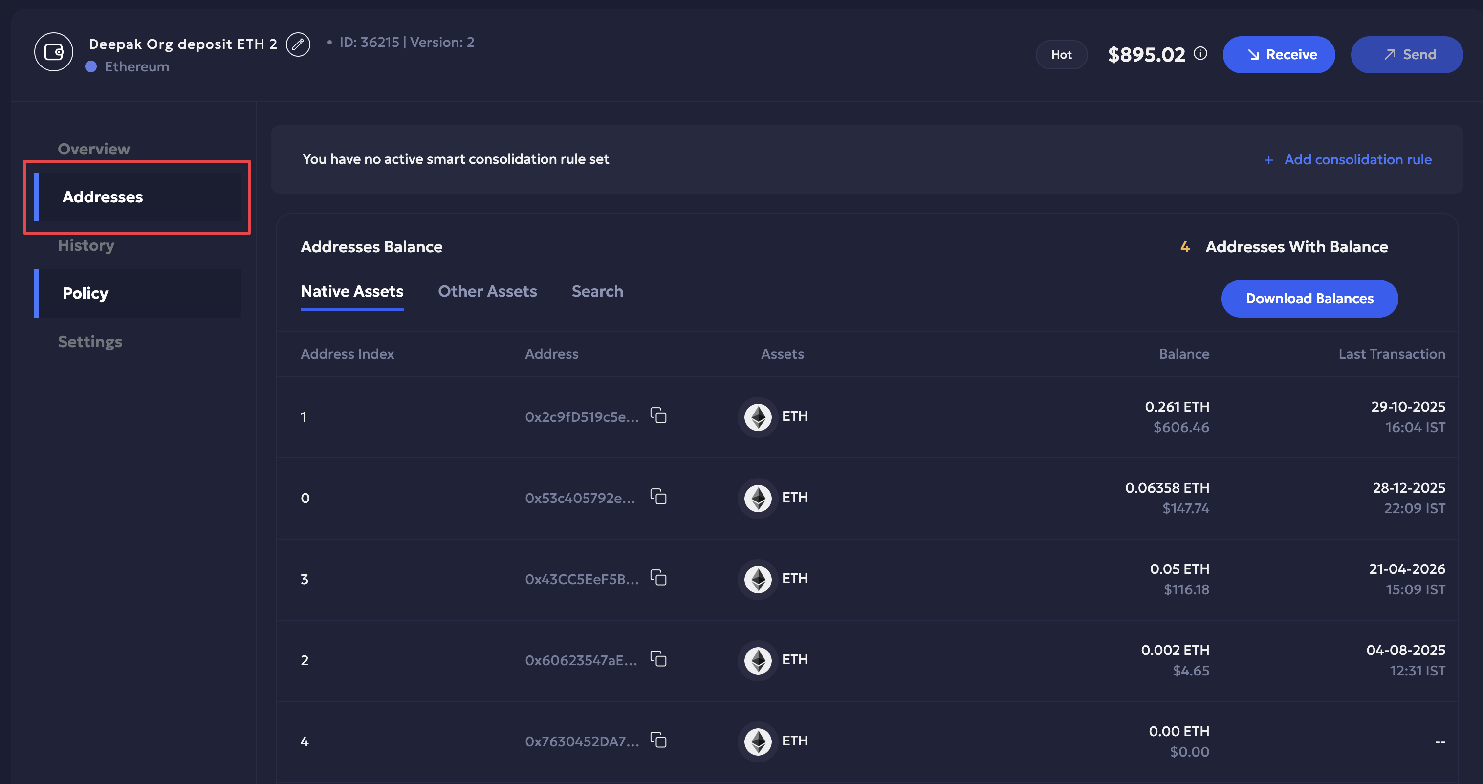 - Native assets: Lists the native assets available for every address in the deposit wallet. It includes the address index, address, assets, balance and last transaction in its address balance metadata.