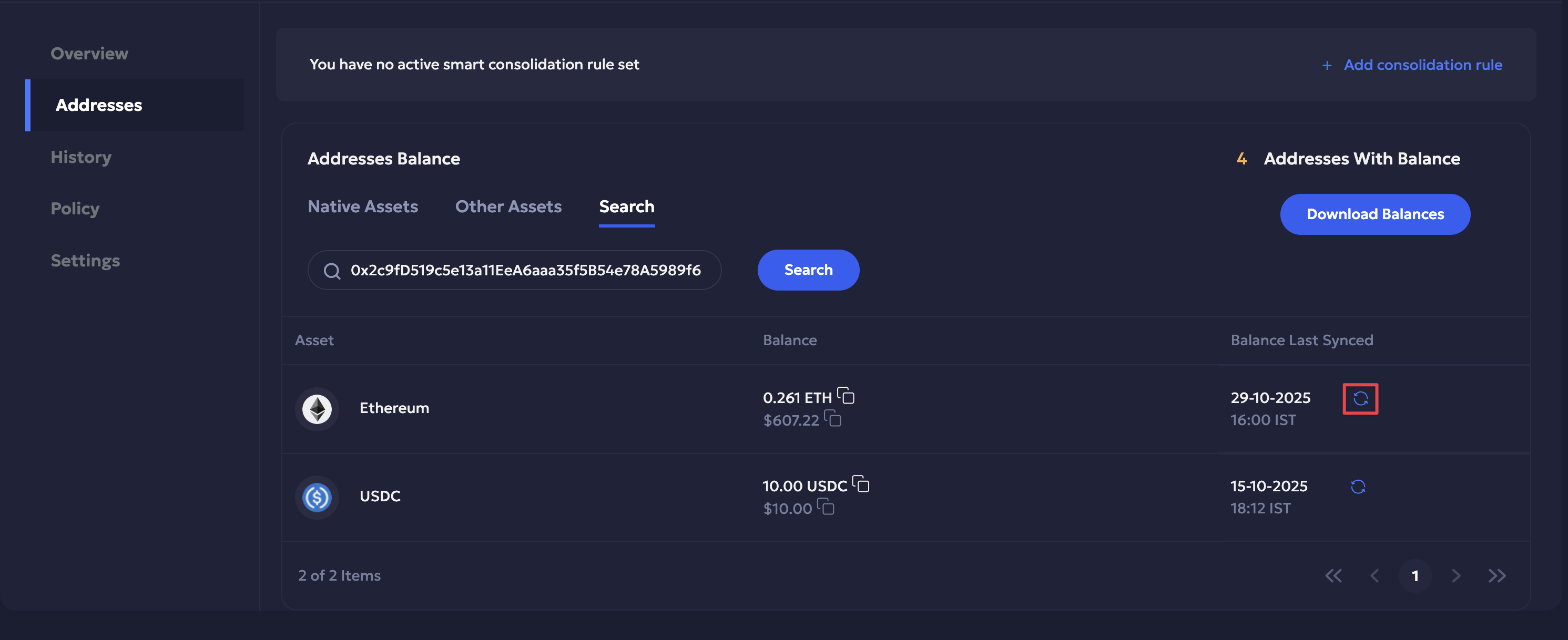 - You can manually sync balances of individual assets if required.