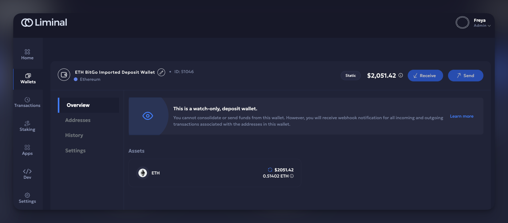 - Liminal Vaults web > Wallets dashboard: View wallet details, manually sync balances, analyse address balances, and manage members.