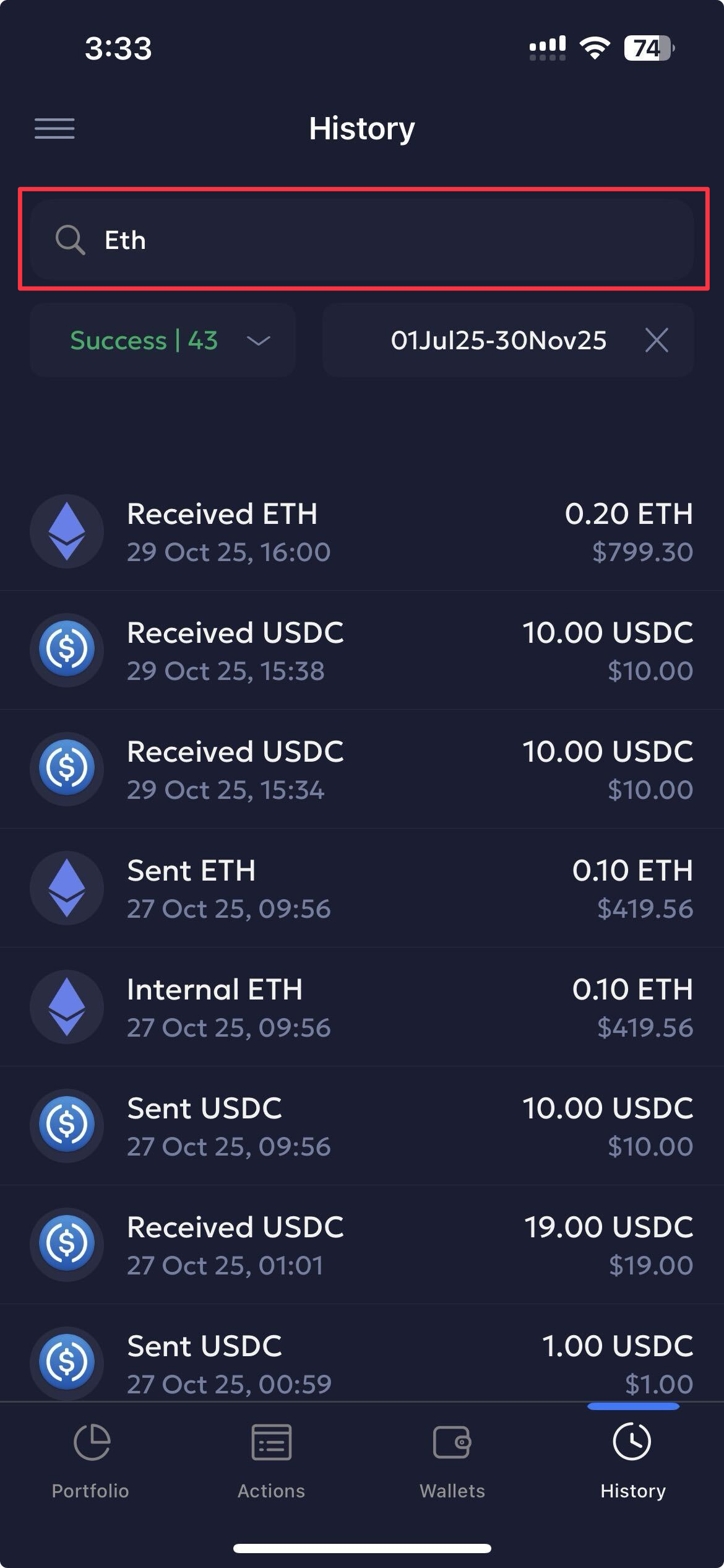 Search: Use the search bar at the top to search for required transactions. Example keywords: Receive, Send, Asset, etc.