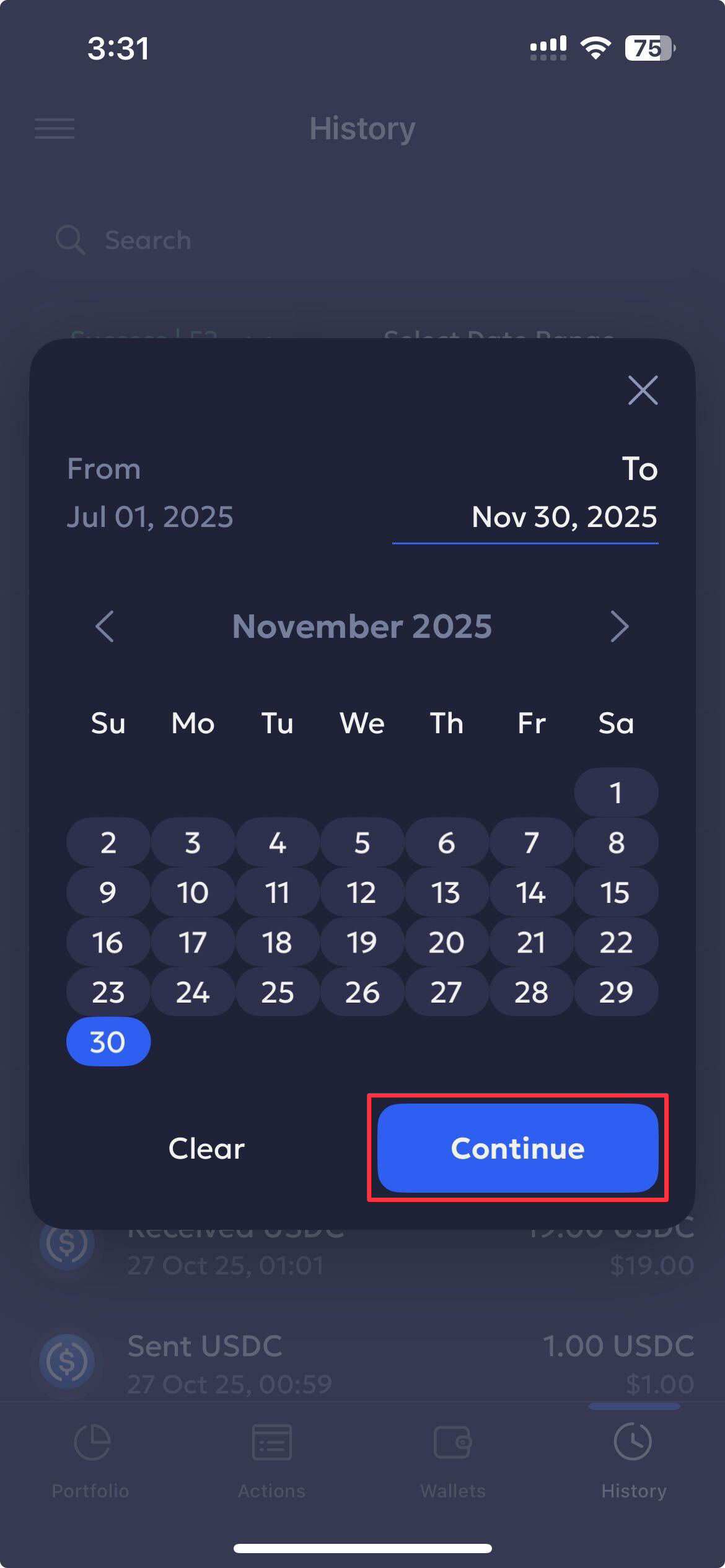 Date Range: Select a date range from the picker to filter transactions from within the specified period using the calendar.