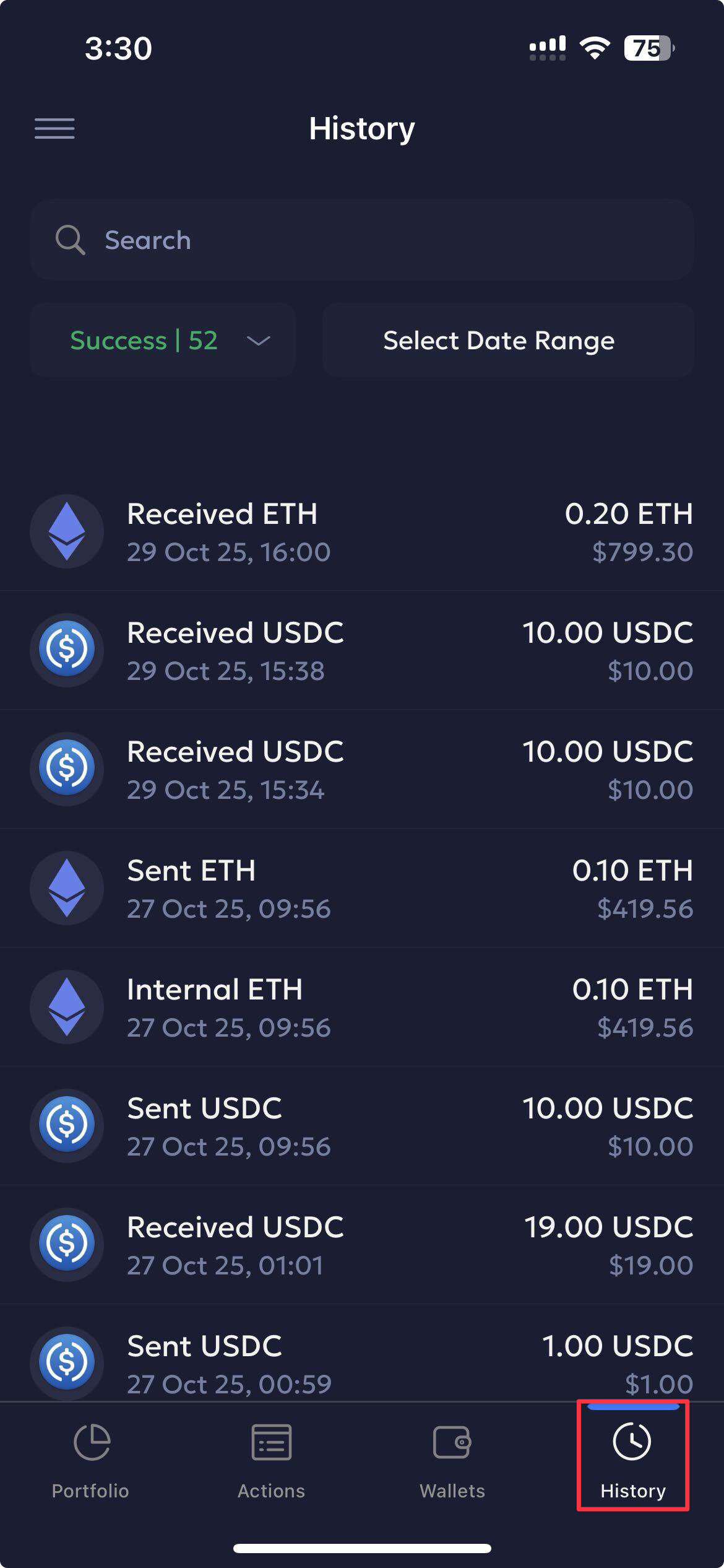 Tap History to navigate to the transaction history page. You can perform the following actions: