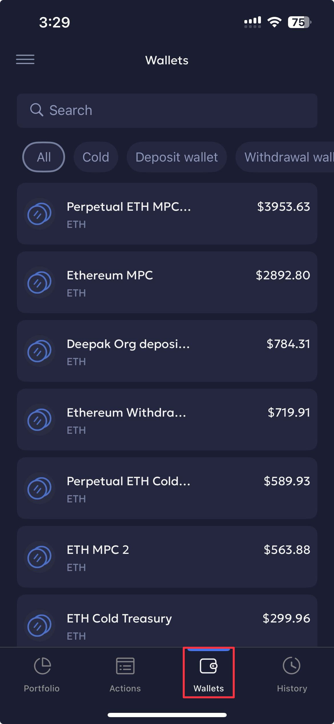 - Filter: Select wallets based on All, Cold, Deposit wallet and Withdrawal wallet filters.