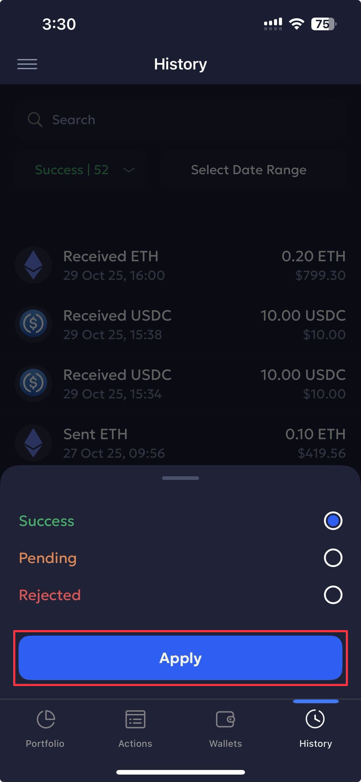 Transaction status: Filter transactions based on their statuses. Click either the Success, Pending, or Rejected statuses.