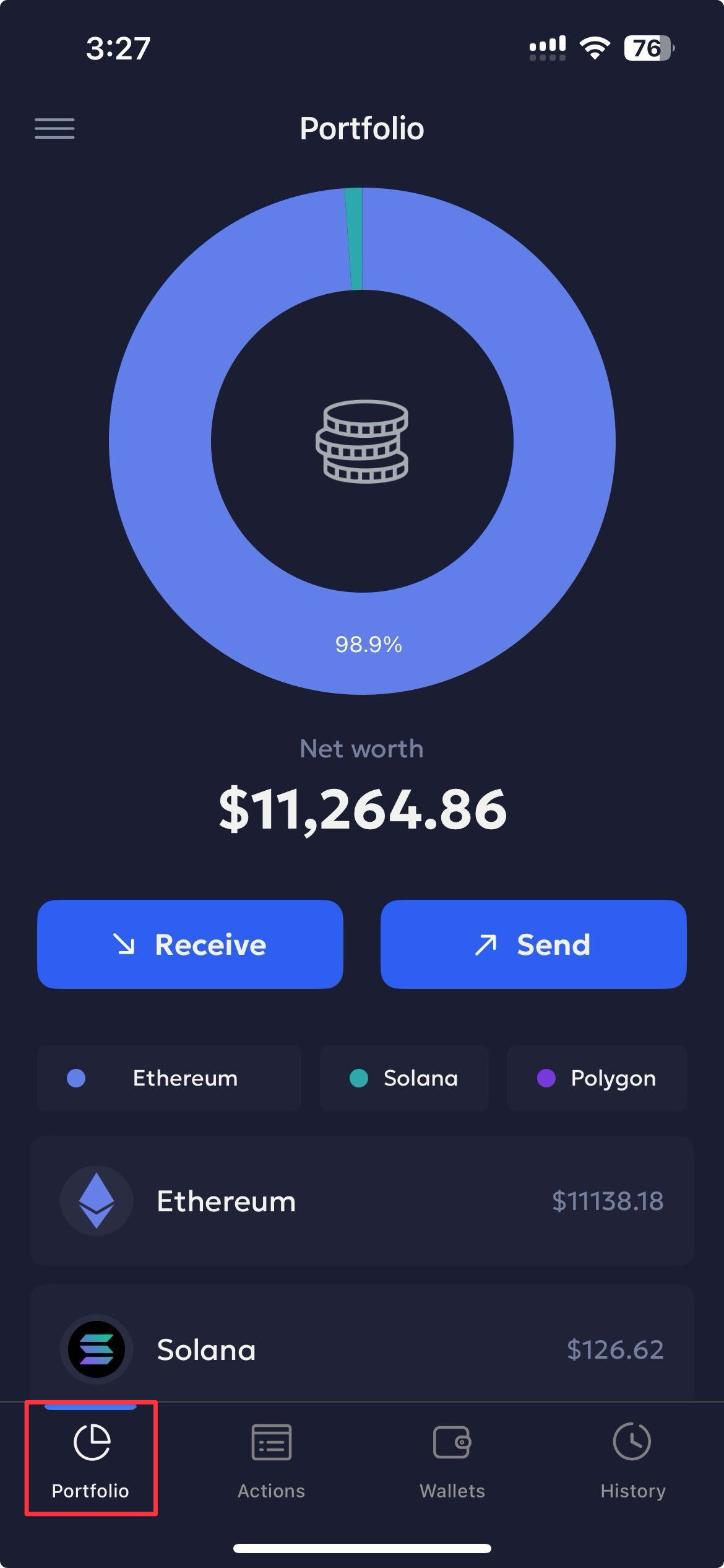 You can view real-time asset balances across your wallets. The portfolio dashboard shows: