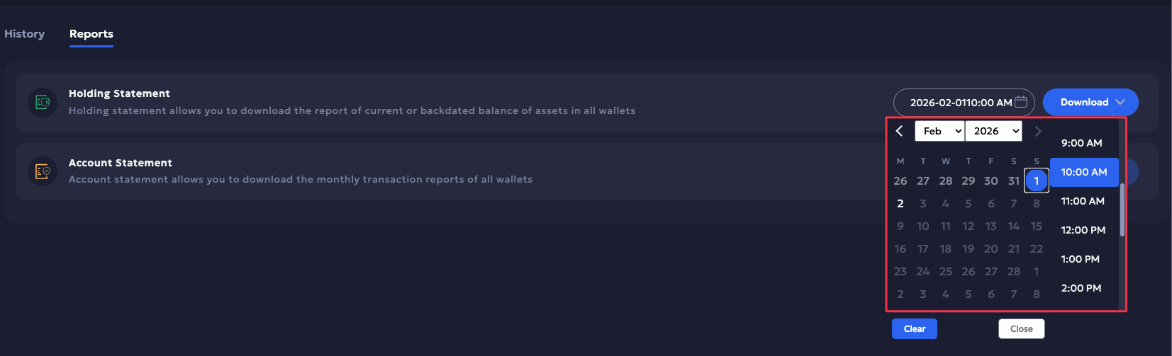 A backdated snapshot captures the state of all assets as it existed on a specific earlier time and date. This includes the historical USD value of each asset, calculated using the average exchange rate for that day, allowing accurate reconciliation and auditing of past holdings. Snapshots are captured daily at 11:45 PM UTC to update the latest holding statement image. You can select a time at hourly intervals between 1.00 AM and 11:00 PM UTC.