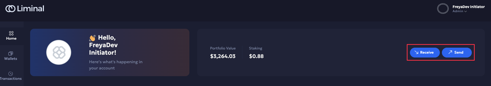 Home page: Click either theReceive or Send button in the top-right corner of the Home page to open the respective transaction flow.