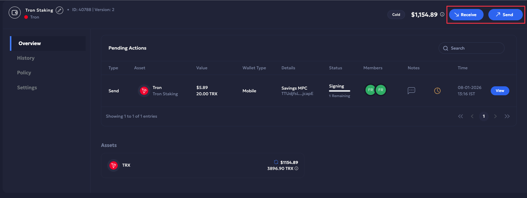 Vaults supports an additional auto-expiry window for Tron MPC and Multisig transactions when sending funds. The auto-expiration feature encourages seamless transaction initiation and signing approvals, facilitating faster completions. It supports a countdown Timer to indicate a transaction’s completion urgency and automatically expires incomplete transactions post the 24-hour window.