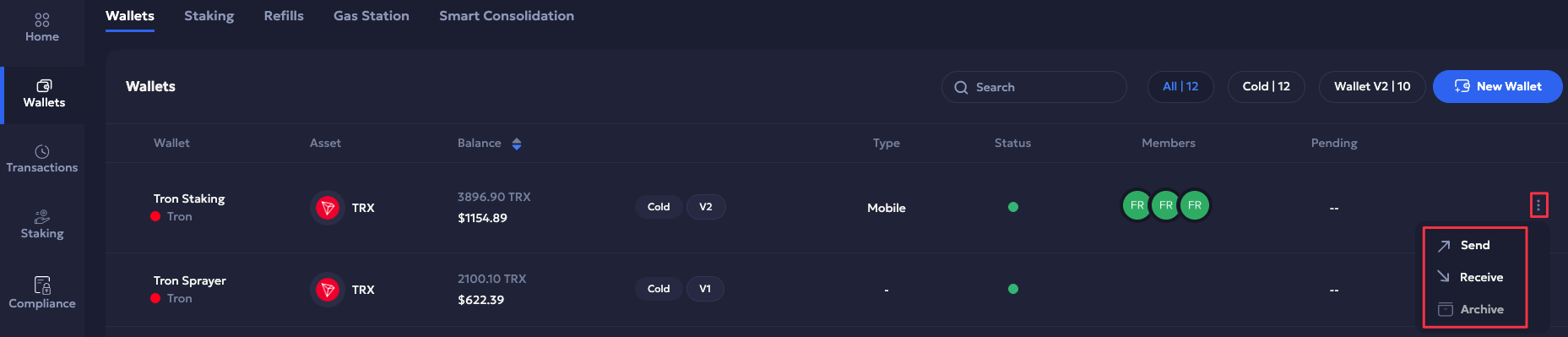 Navigate to the right of a respective wallet and click the three-dot Actions menu.